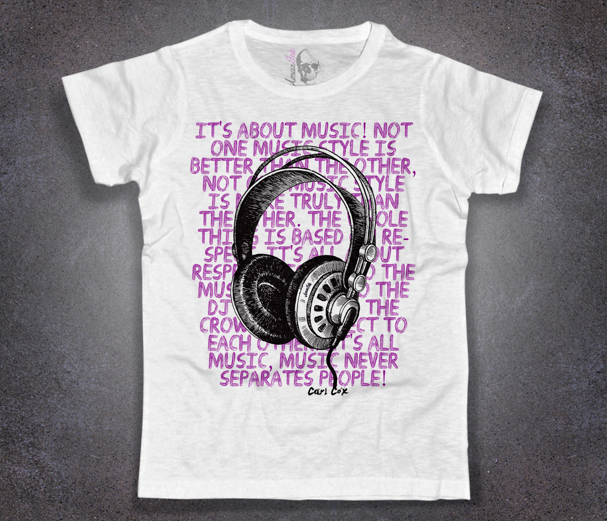 Carl Cox T-shirt – Le parole di un grande Dj  in stile Ink Words: “It’s about music! Not one music style is better than the other, not one music style is more truly than the other. The whole thing is based on respect. It’s all about respect, respect to the music, respect to the DJ’s, respect to the crowd and respect to each other. It’s all music, music never separates people!”