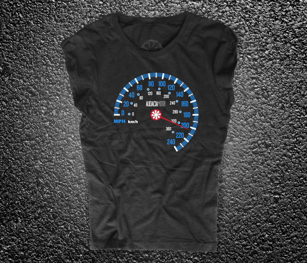Speedometers black woman’s t-shirt – T-shirt depicting a speedometer with the needle which is more than 200 km/h, speed and madness in real Audacia Motori style. Audacia Motori is power, resourcefulness, courage, boldness, defiance, on the road, but not only. A brand that such a style, made of elegance, efficiency and passion; automotive icon, to show off, live and feel, thanks to an excellent fusion between design and speed. Audacia Motori leaves a scratchy sign is asphalt and is on fashion, daring to dare and teaching.