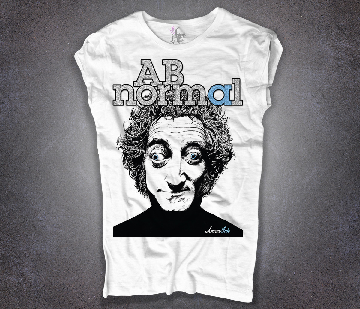 Marty Feldman T-shirt – T-shirt donna bianca raffigurante l’inconfondibile viso, dal naso schiacciato e gli occhi tiroidei, del comico attore e performer Marty Feldman e scritta AB Normal.