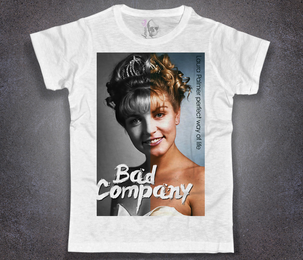 Laura Palmer T-shirt – T-shirt uomo bianca raffigurante la celebre immagine di Laura Palmer, “protagonista” della serie Twin Peaks e la scritta ironica “Bad Company, Laura Palmer a Perfect way of life”.
